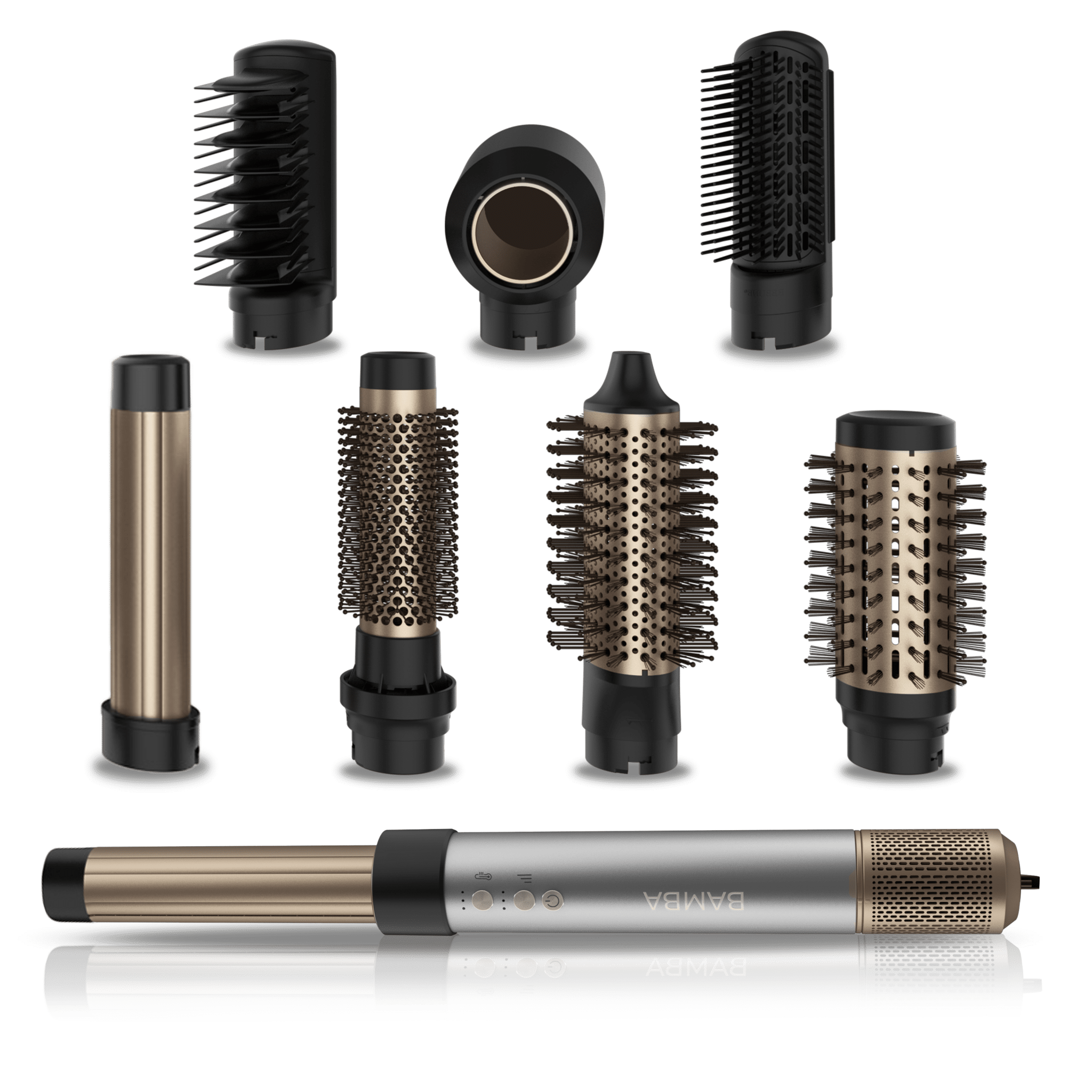 Bamba CeramicCare AirGlam Aluminum Moldeador multifunción 8 en 1 con tecnología Coanda que moldea, riza, peina, seca y elimina el efecto frizz. Con 3 velocidades, 3 temperaturas, y control inteligente del calor. Motor digital 1400 W de potencia y 110000 rpm. Cabezales con revestimiento de cerámica, keratina y aceite de almendras.