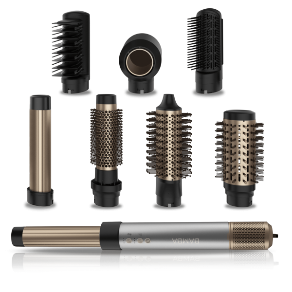 Bamba CeramicCare AirGlam Aluminum Moldeador multifunción 8 en 1 con tecnología Coanda que moldea, riza, peina, seca y elimina el efecto frizz. Con 3 velocidades, 3 temperaturas, y control inteligente del calor. Motor digital 1400 W de potencia y 110000 rpm. Cabezales con revestimiento de cerámica, keratina y aceite de almendras.