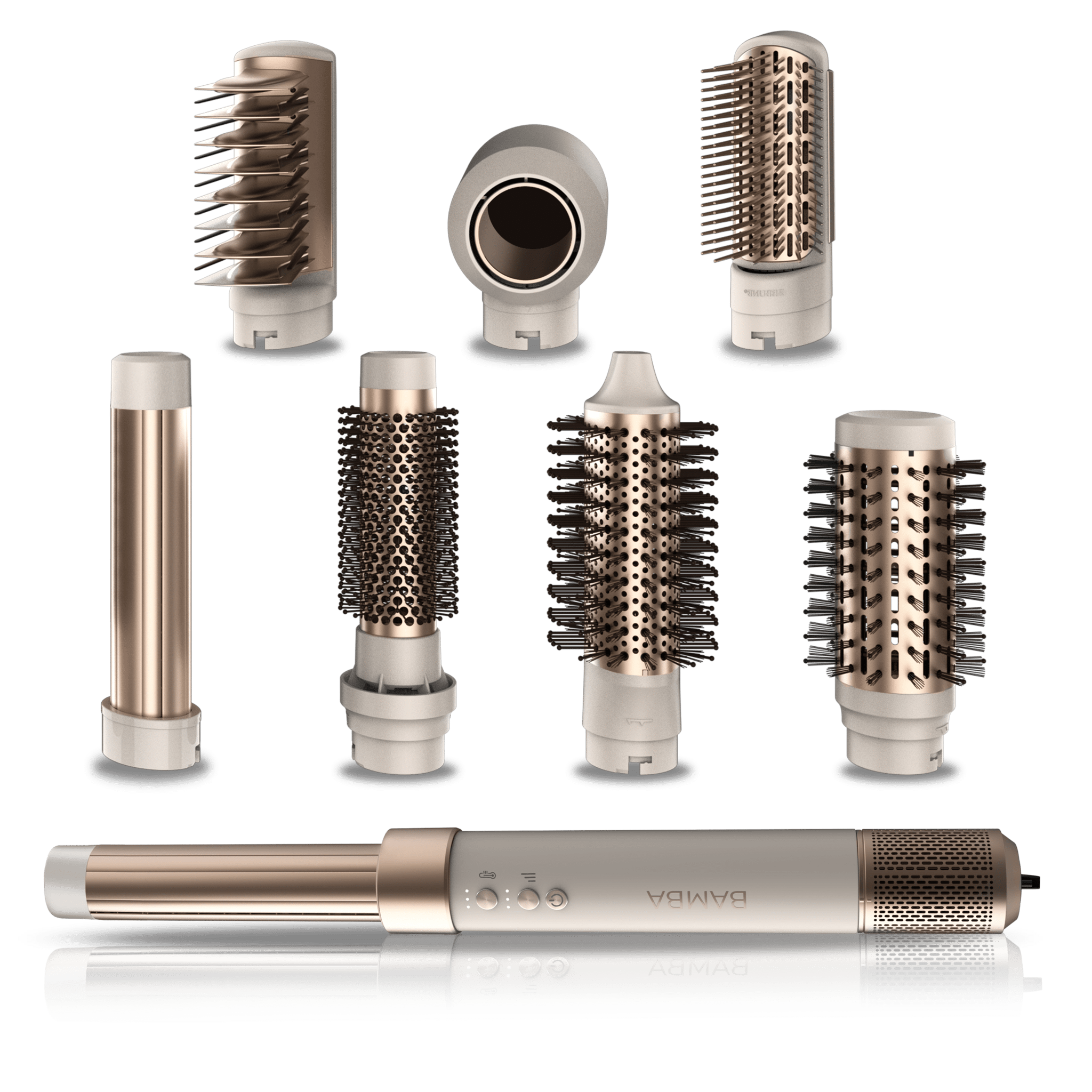 Bamba CeramicCare AirGlam Champagne Moldeador multifunción 8 en 1 con tecnología Coanda que moldea, riza, peina, seca y elimina el efecto frizz. Con 3 velocidades, 3 temperaturas, y control inteligente del calor. Motor digital 1400 W de potencia y 110000 rpm. Cabezales con revestimiento de cerámica, keratina y aceite de almendras.