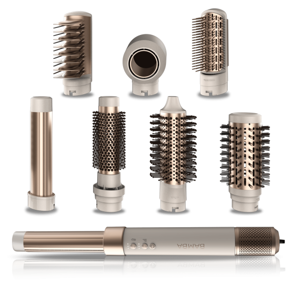 Bamba CeramicCare AirGlam Champagne Moldeador multifunción 8 en 1 con tecnología Coanda que moldea, riza, peina, seca y elimina el efecto frizz. Con 3 velocidades, 3 temperaturas, y control inteligente del calor. Motor digital 1400 W de potencia y 110000 rpm. Cabezales con revestimiento de cerámica, keratina y aceite de almendras.