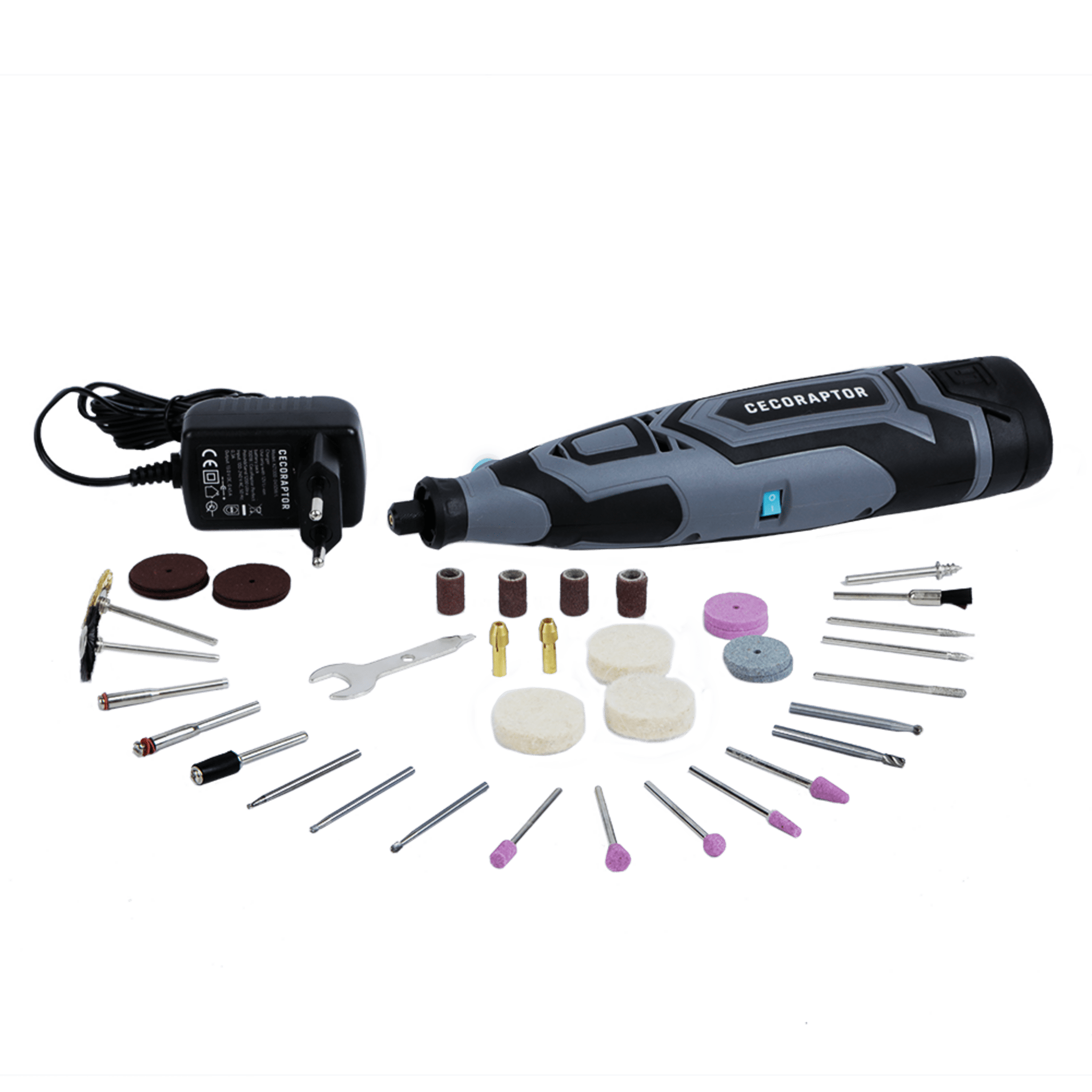 Multiherramienta rotativa de precisión CecoRaptor Perfect Polish&Sand 1200 Ultra 1 batería de 12V y 1.500mAh Kit de accesorios con 60 piezas Cargador para batería de 12V con adaptador de corriente