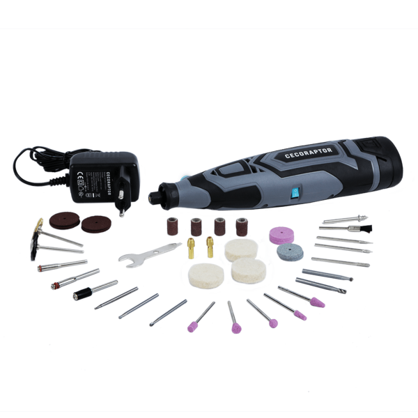 Multiherramienta rotativa de precisión CecoRaptor Perfect Polish&Sand 1200 Ultra 1 batería de 12V y 1.500mAh Kit de accesorios con 60 piezas Cargador para batería de 12V con adaptador de corriente