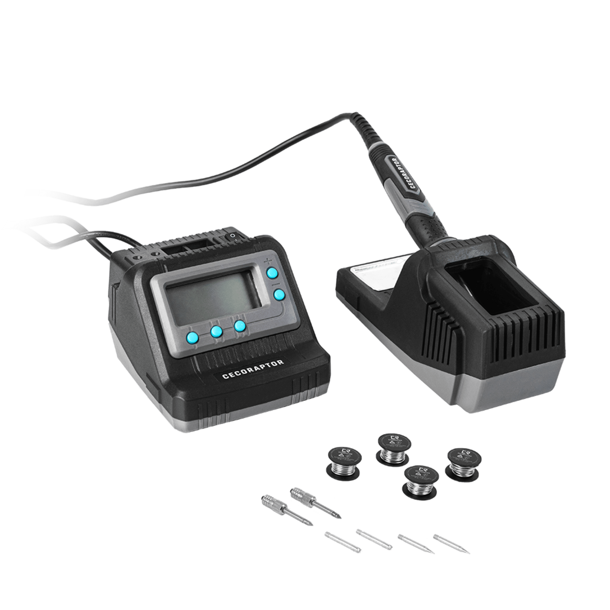 Estación de soldadura CecoRaptor Perfect SolderStation 600 Advance Soporte de soldador y bandeja para esponja de soldadura 5 x Puntas de soldadura 2 x Bobinas de estaño para soldar de 10 g para soldadura de 1,0 mm de diámetro 2 x Bobinas de estaño para soldar de 10 g para soldadura de 1,5 mm de diámetro 1 x esponja de soldadura Manual de instrucciones