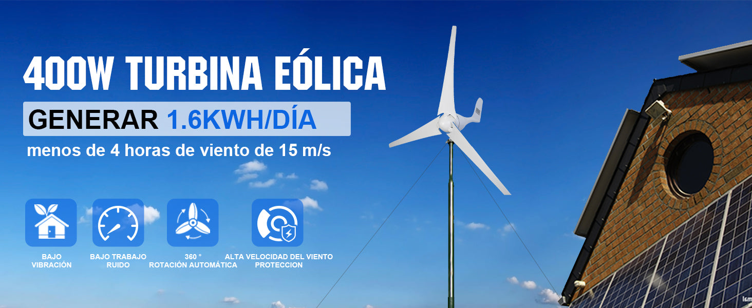 ECO-WORTHY La turbina eólica de 400W 12V/24V es una opción inteligente y asequible para casas y cabañas remotas en áreas ventosas. La electricidad producida por la generación eólica se puede almacenar en baterías para uso doméstico cuando sea necesario. Los aerogeneradores se pueden utilizar solos o como parte de un sistema híbrido, en el que su potencia se combina con la fotovoltaica. Los sistemas híbridos son especialmente útiles para la copia de seguridad en invierno de sistemas domésticos donde el clima nublado y las condiciones de viento ocurren simultáneamente.