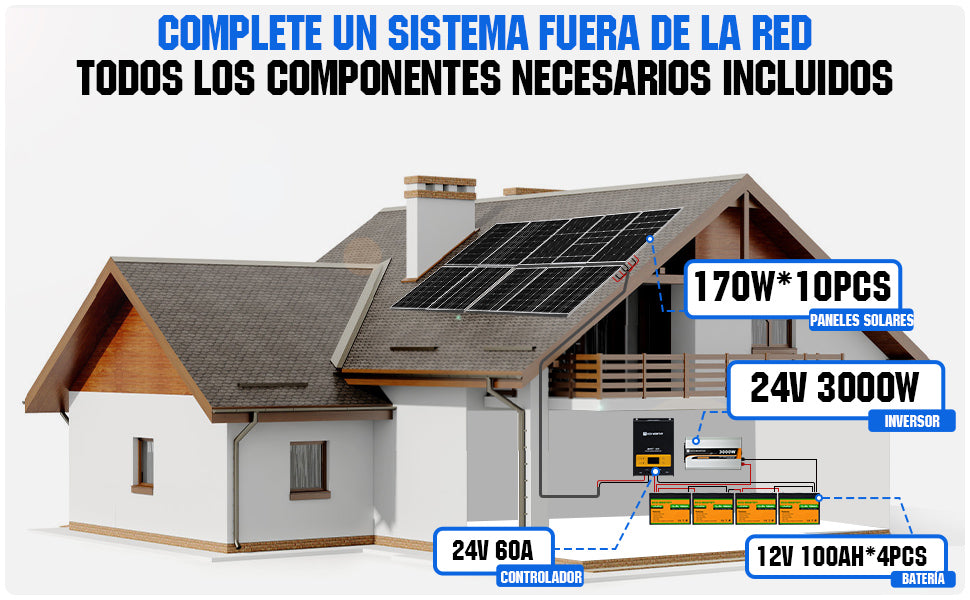 Este kit completo incluye Panel solar 170W 12V alto rendimiento, Regulador solar 60A, Inversor de onda sinusoidal pura, Batería Litio y todos los elementos fotovoltaicos necesarios.