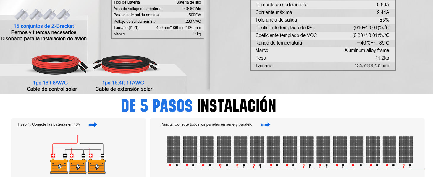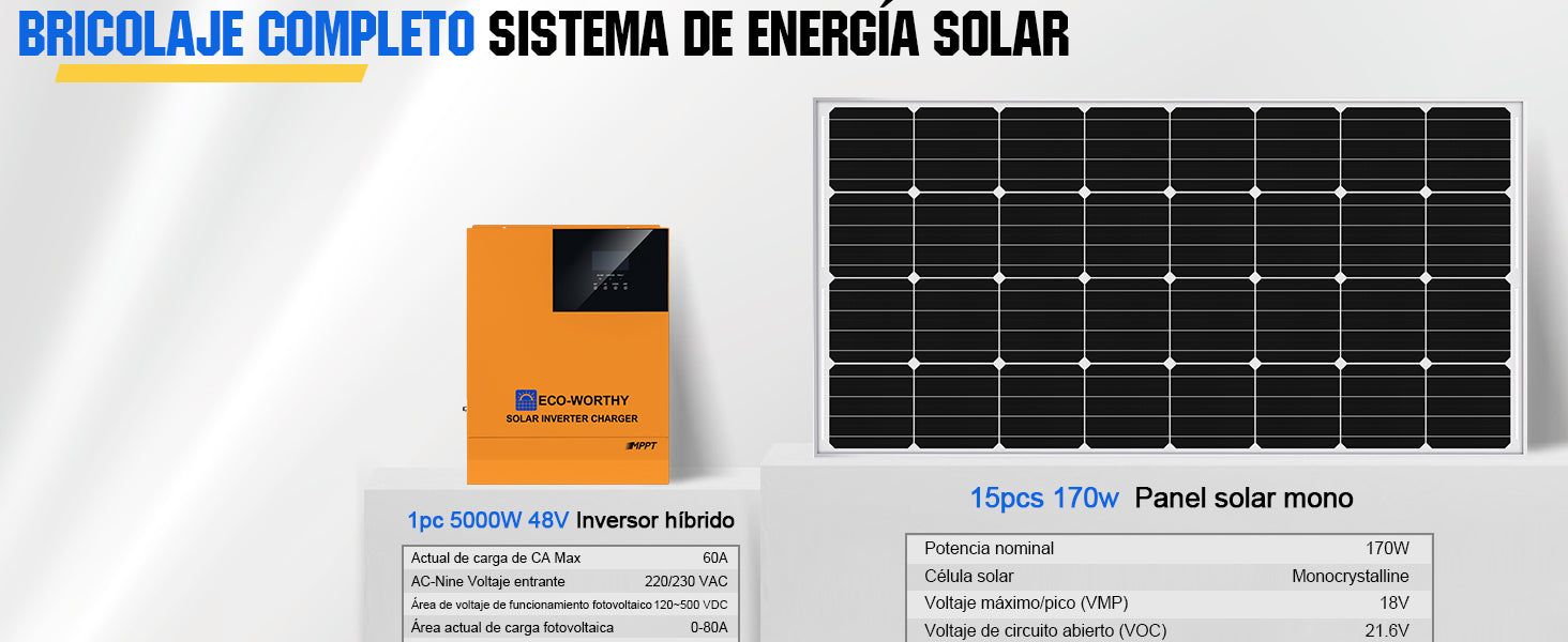 ECO-WORTHY Kit Solar Aislada 2550W 48V (15x170W) con MPPT Inversor Cargador 5kW+Batería de Litio 4.8kWh