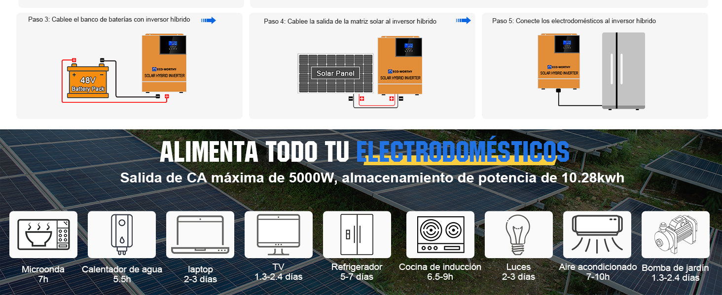 Con Batería Litio LiFePO4 de ECO-WORTHY con más de 3000 ciclos con profundidades de descarga del 95%, paneles solares con garantía de 25 años.