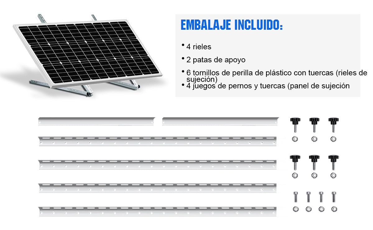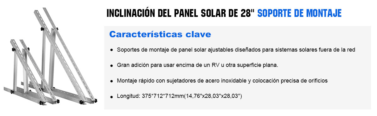 ECO-WORTHY 28″ & 41″ Soportes de montaje inclinables de panel solar de longitud ajustable diseñados para sistemas solares fuera de la red, como vehículos recreativos, marinos, casas rodantes, techos, cobertizos, etc. Montaje rápido con sujetadores de acero inoxidable y colocación precisa de orificios. Obtenga hasta un 25% más de eficiencia de los paneles solares inclinando los paneles hacia el sol en lugar de colocarlos planos.