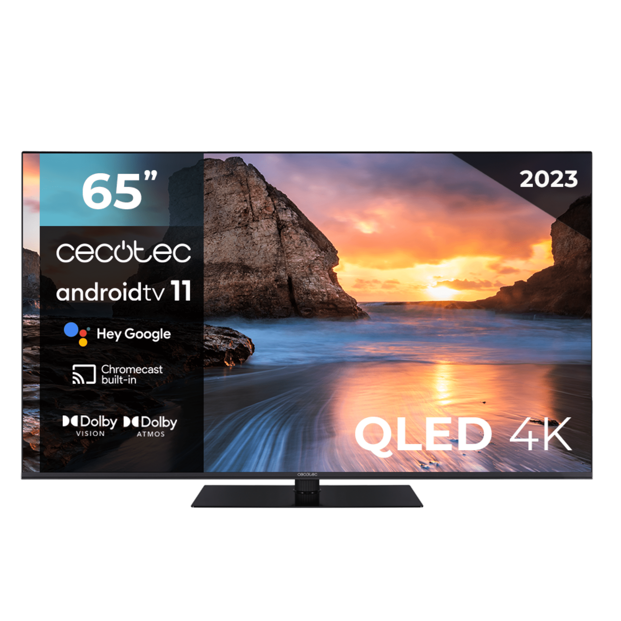 Televisores QLED Televisión QLED 65” con resolución 4K UHD, sistema operativo Android TV 11, subwoofers, Chromecast, HDR10+, Google Voice Assistant, clase E. Android TV.V.11: la mejor experiencia de uso con una gran colección de aplicaciones. Chromecast integrado para enviar contenido de forma sencilla y rápida. 4K UHD: imágenes ultra nítidas y con alta definición incluso en detalles. Diseño Frameless: minimiza el margen entre marcos e imagen para mejorar la experiencia de visión. MEMC: añade fotogramas de compensación para generar imágenes más fluidas y nítidas. Dolby Vision: optimiza cada fotograma para mostrar imágenes más puras y reales. Dolby Atmos: sonido envolvente multidimensional de 360º para escuchar el sonido de forma real. Subwoofer: sistema de altavoces que mejora los bajos y crea una experiencia de audio superior. HDR10: procesa la imagen y consigue la mayor profundidad de color. HDMI 2.1: permite altas frecuencias y resoluciones sin dañar la imagen de origen. Pure Dimming/Pure Move/Pure Outline: mejora el brillo, la definición y el movimiento de cada imagen. ALLM: configura la latencia de forma automática para mejorar la experiencia de juego de tu consola. Pantalla 10 Bits: reproduce más de 1000 millones de colores. Eye Safe: minimiza la emisión de luz azul para proteger los ojos. Peana central rotativa.