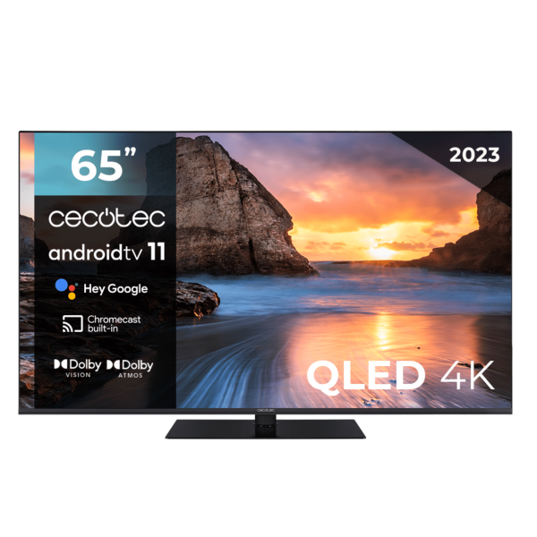 Televisores QLED Televisión QLED 65” con resolución 4K UHD, sistema operativo Android TV 11, subwoofers, Chromecast, HDR10+, Google Voice Assistant, clase E. Android TV.V.11: la mejor experiencia de uso con una gran colección de aplicaciones. Chromecast integrado para enviar contenido de forma sencilla y rápida. 4K UHD: imágenes ultra nítidas y con alta definición incluso en detalles. Diseño Frameless: minimiza el margen entre marcos e imagen para mejorar la experiencia de visión. MEMC: añade fotogramas de compensación para generar imágenes más fluidas y nítidas. Dolby Vision: optimiza cada fotograma para mostrar imágenes más puras y reales. Dolby Atmos: sonido envolvente multidimensional de 360º para escuchar el sonido de forma real. Subwoofer: sistema de altavoces que mejora los bajos y crea una experiencia de audio superior. HDR10: procesa la imagen y consigue la mayor profundidad de color. HDMI 2.1: permite altas frecuencias y resoluciones sin dañar la imagen de origen. Pure Dimming/Pure Move/Pure Outline: mejora el brillo, la definición y el movimiento de cada imagen. ALLM: configura la latencia de forma automática para mejorar la experiencia de juego de tu consola. Pantalla 10 Bits: reproduce más de 1000 millones de colores. Eye Safe: minimiza la emisión de luz azul para proteger los ojos. Peana central rotativa.