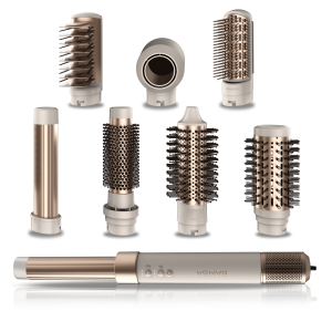 Bamba CeramicCare AirGlam Champagne Moldeador multifunción 8 en 1 con tecnología Coanda que moldea, riza, peina, seca y elimina el efecto frizz. Con 3 velocidades, 3 temperaturas, y control inteligente del calor. Motor digital 1400 W de potencia y 110000 rpm. Cabezales con revestimiento de cerámica, keratina y aceite de almendras.