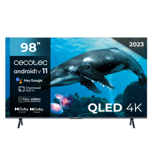 TV QLED V3+ series VQU30098+ Televisión QLED de gran pulgada con 98″ resolución 4K UHD y Android TV 11, Full Array Local Dimming, 120 Hz, Altavoces con 60W, Dolby Vision & Atmos, Wide Colour Gamut, HDR10, HDM 2.1, USB 3.0, CORTEX A55, Google Voice Assitant y Chromecast.